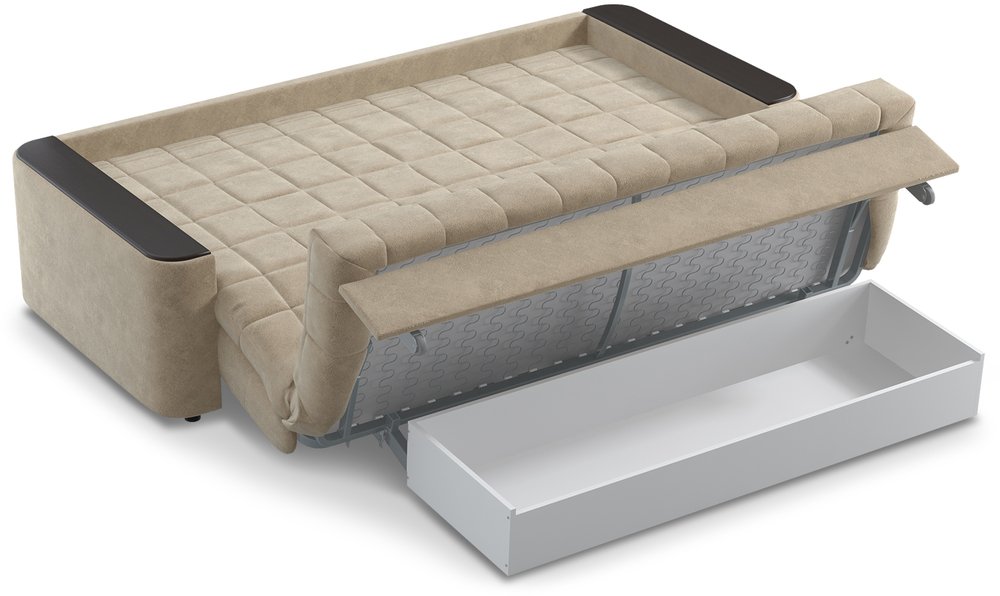 Достоинства: Прекрасное решение для малогабаритных комнат (в нашем случае совместили спальню и гостиную). Спать комфортно и удобно. Раскладывается легко. 2 подушки в комплекте (желательно взять ящик (мы не брали), чтобы убирать подушки и покрывало для дивана, когда он в разобранном виде. В собранном виде - не знаю поместится ли все постельное белье, т.к. 2 одеяла, 4 подушки.)