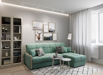 Спинка, выполненная в обивочной ткани, позволяет ставить диван в центре комнаты и зонировать пространство.
