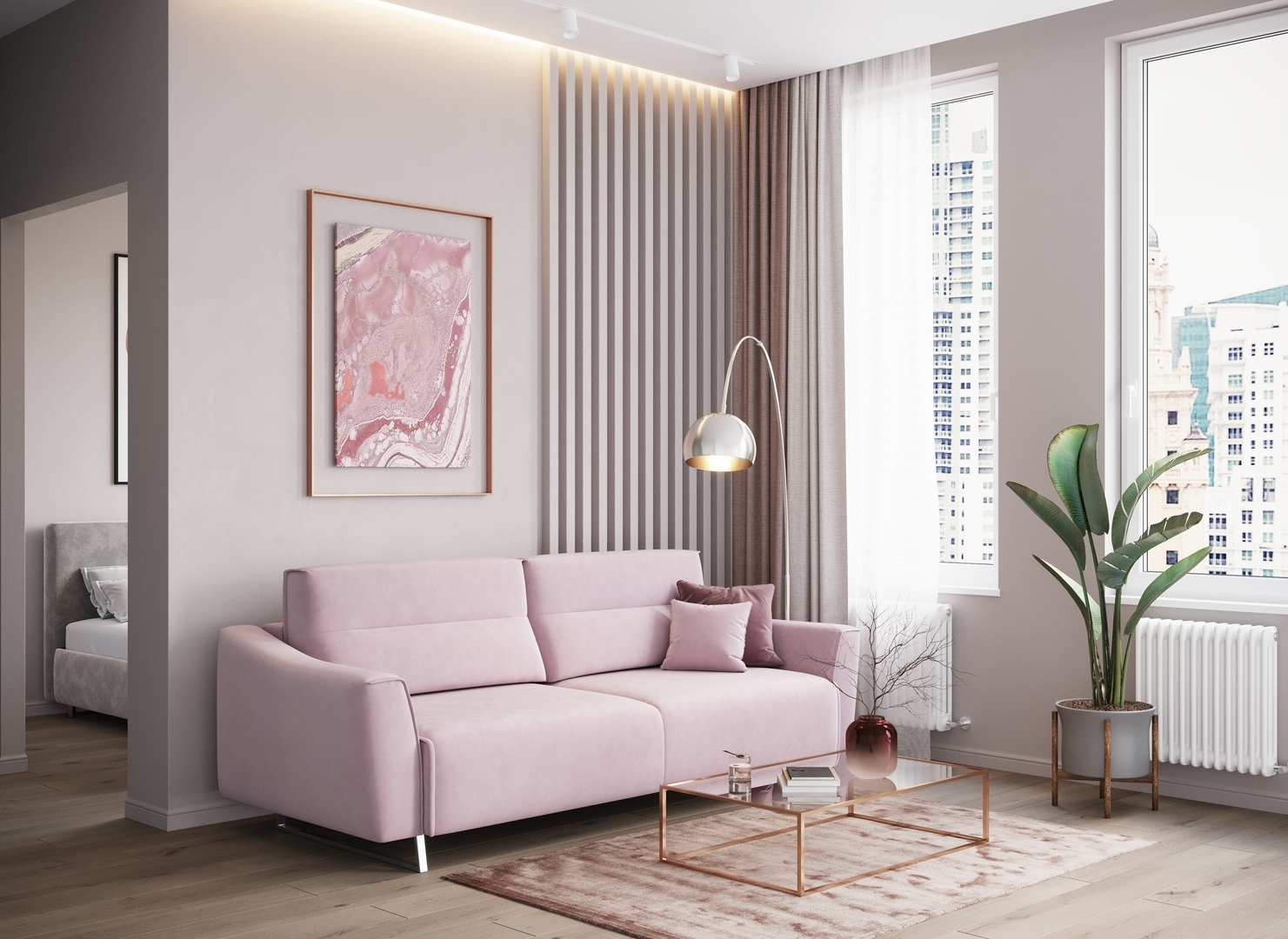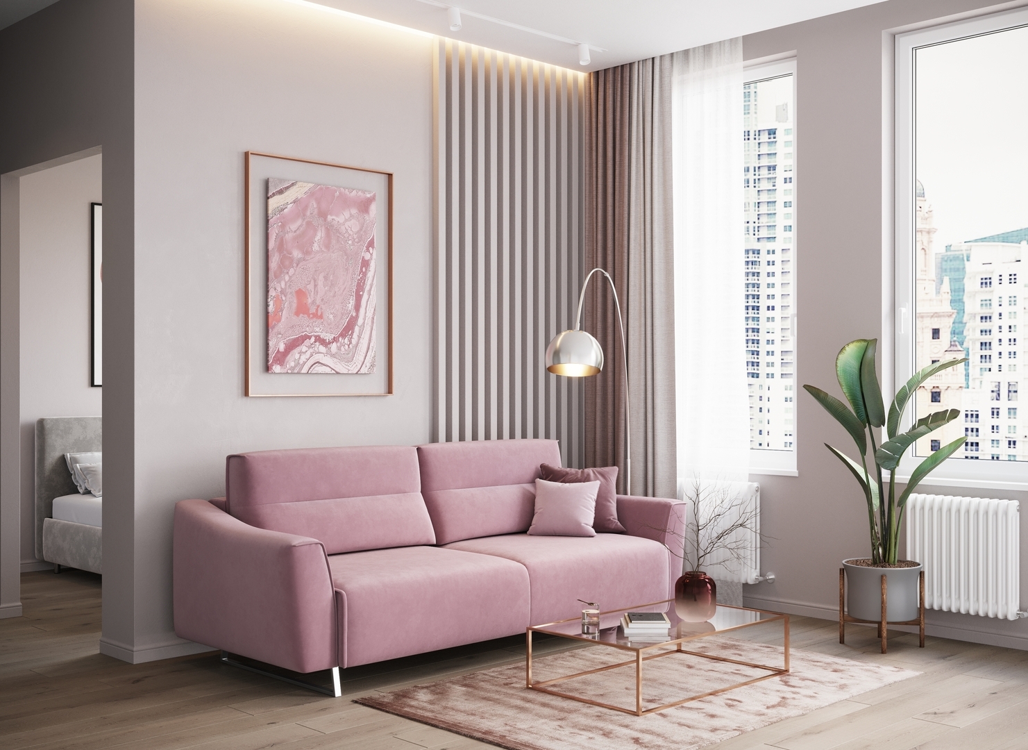 Декоративный кант, частично проходящий по элементам дивана, подчеркивает роскошь форм, усиливая эстетику образа.