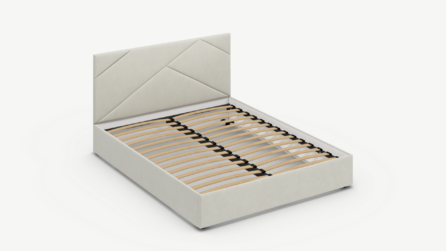 MOON FAMILY 1257 привлекает внимание оригинальным исполнением: широкие полосы ткани эффектно пересекают периметр изголовья, создавая на нем графический орнамент. Лаконичные формы объемных царг создают единый гармоничный образ и фокусируют внимание на центральном текстурном элементе кровати.