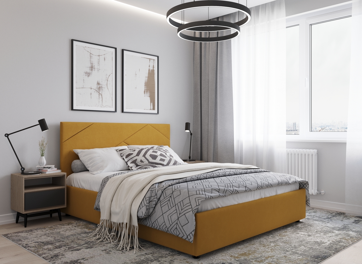 MOON FAMILY 1257 привлекает внимание оригинальным исполнением: широкие полосы ткани эффектно пересекают периметр изголовья, создавая на нем графический орнамент. Элегантным и практичным акцентом служат скрытые карманы, расположенные по его углам. Лаконичные формы объемных царг создают единый гармоничный образ и фокусируют внимание на центральном текстурном элементе кровати.