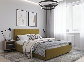 MOON FAMILY 1257 привлекает внимание оригинальным исполнением: широкие полосы ткани эффектно пересекают периметр изголовья, создавая на нем графический орнамент. Лаконичные формы объемных царг создают единый гармоничный образ и фокусируют внимание на центральном текстурном элементе кровати.