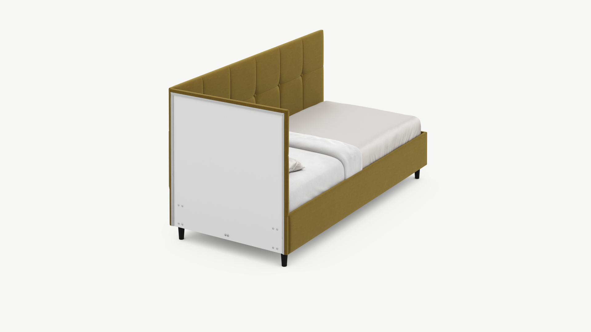 Угловая односпальная кровать MOON FAMILY 1261 с мягкой спинкой и изголовьем создаст в Вашей спальне ощущение уюта. Крупная квадратная стежка привносит в интерьер графических акцентов, а вставка из пуговиц наполняет пространство ощущением домашнего тепла.