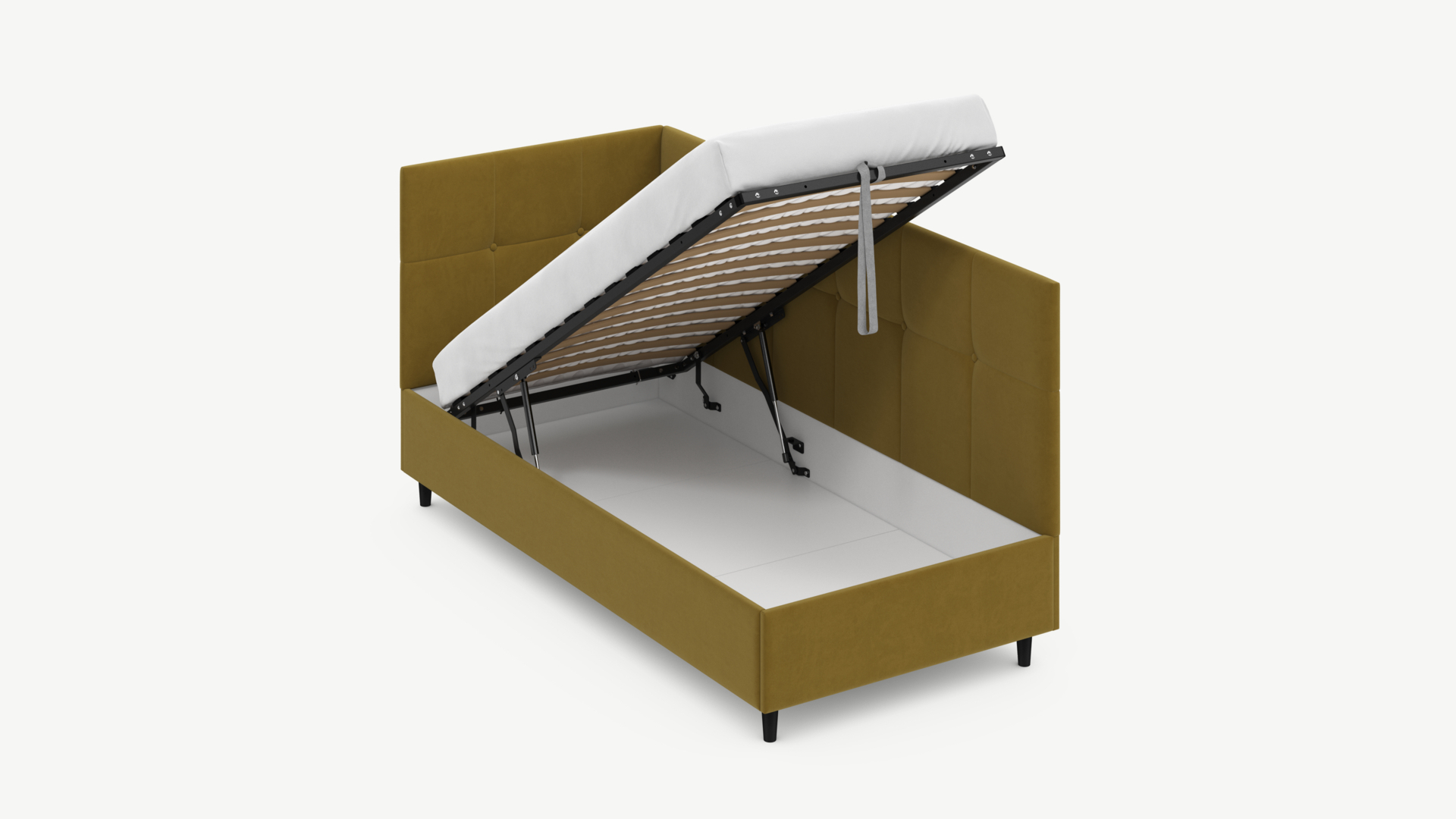 • Скрытая под основанием вместительная емкость без внутренних перегородок позволяет использовать всю площадь подкроватного пространства для хранения вещей.