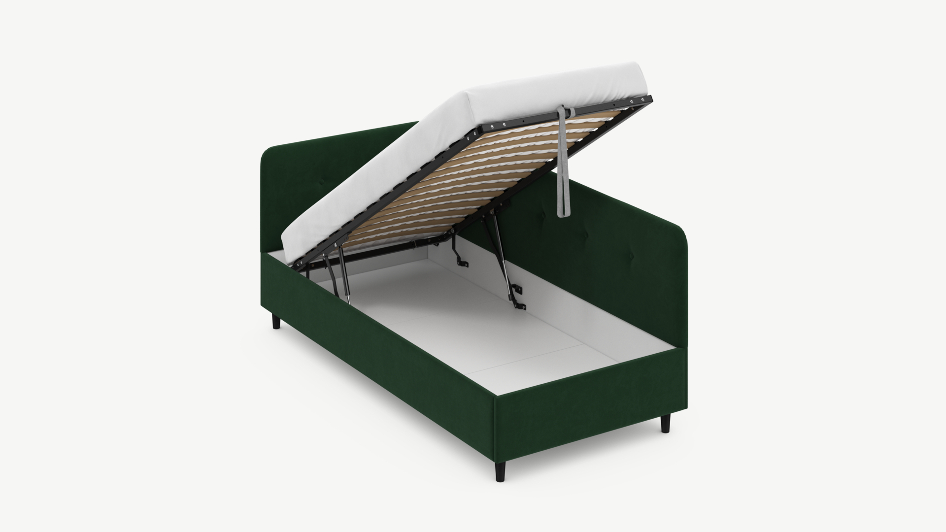 - Скрытая под основанием вместительная емкость без внутренних перегородок позволяет использовать всю площадь подкроватного пространства для хранения вещей.