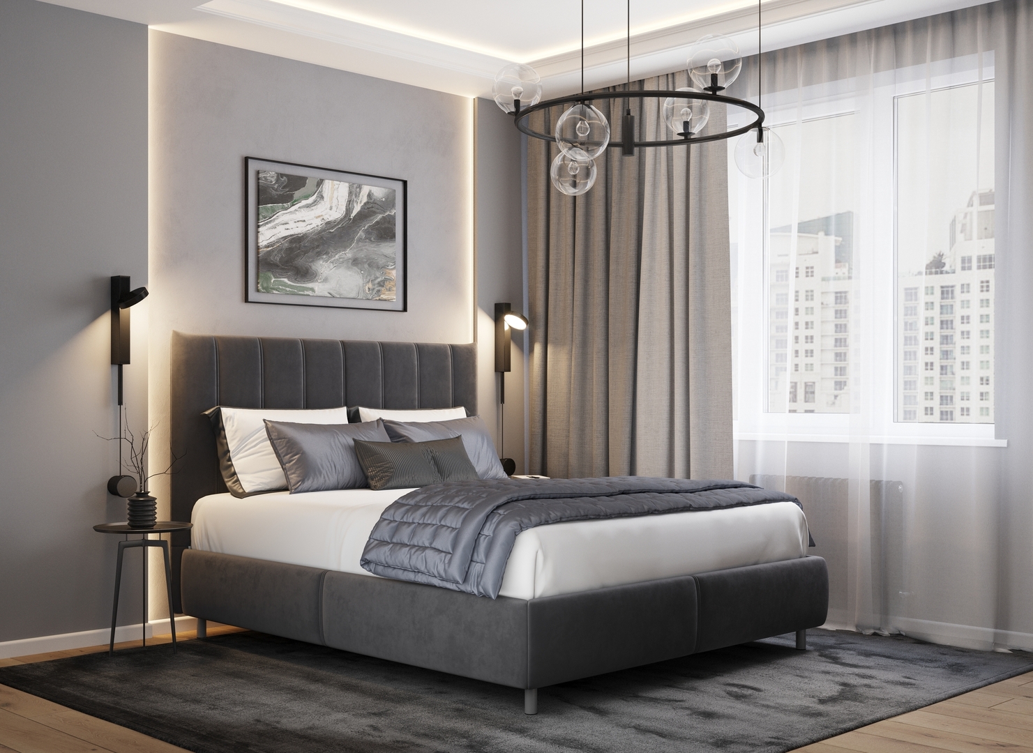 Обратная сторона изголовья выполнена в мебельной ткани и позволяет ставить кровать в центре комнаты для зонирования пространства.