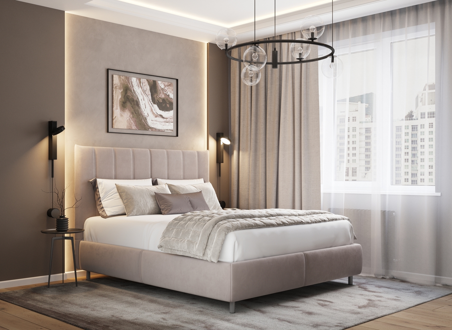 Творчески завершить образ спальни помогут дополнительные аксессуары: декоративные подушки и тумбы.