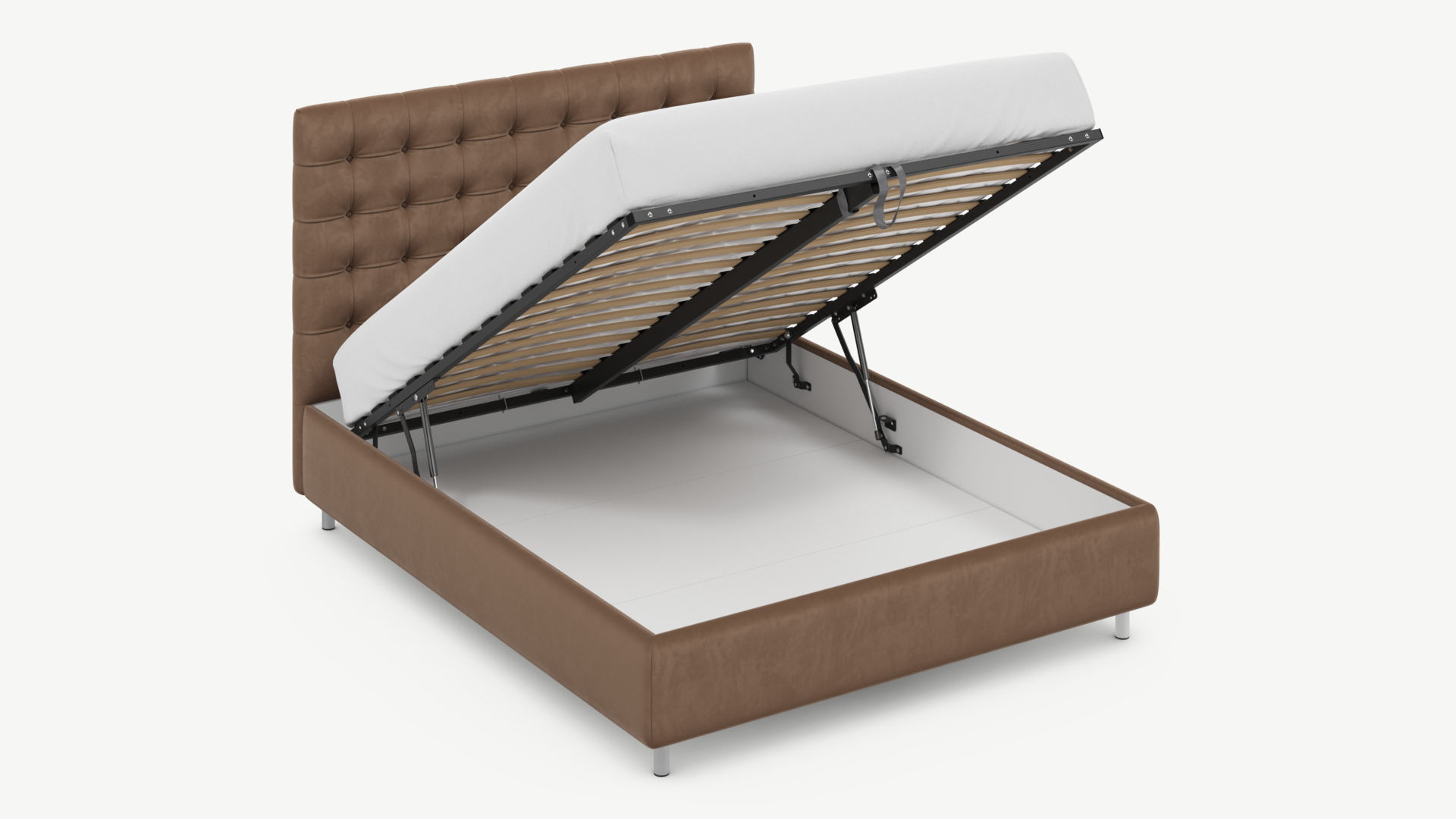 - Скрытая под основанием вместительная емкость без внутренних перегородок позволяет использовать всю площадь подкроватного пространства для хранения вещей.